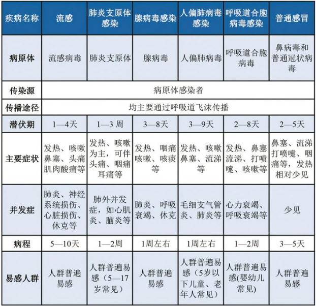 流感与普通感冒、呼吸道合胞病毒、肺炎支原体、人偏肺病毒的区别。